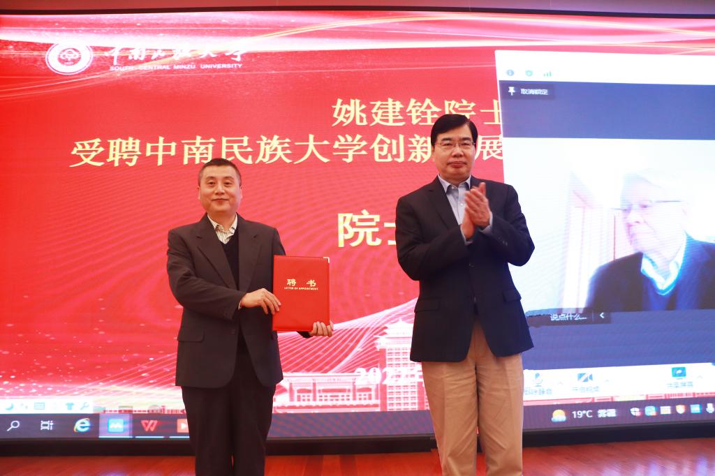 李金林为姚院士在线颁授聘书,凌福日教授(左)受院士委托代接聘书。 蔡兴超摄