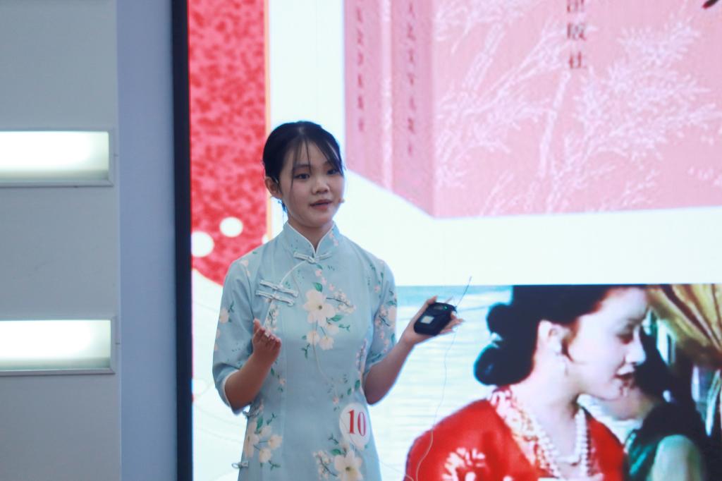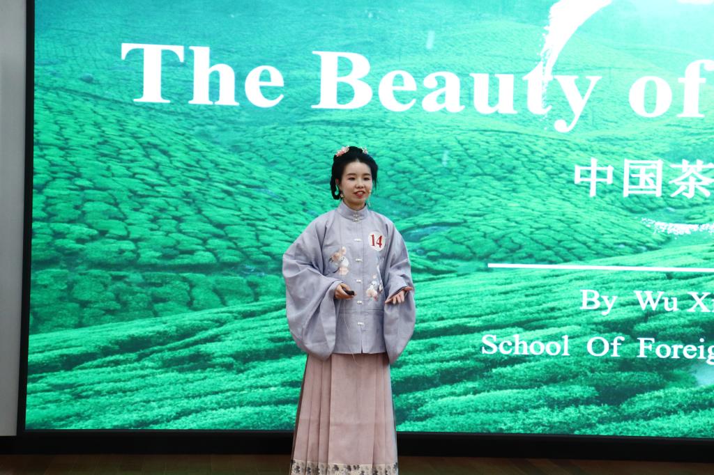 在下午举行的英文赛道决赛中,25位选手用流利的英语向观众们描绘了丰富多彩的中华文化,有精美的民间工艺、有古老的艺术…外语学院的陈晓同,从哲学发展延伸到中华历史文化;生命科学学院的阿迪思身着蒙古族服饰,用一首家乡的蒙古族歌曲,演绎中华之美;中华民族共同体学院的马庆庆讲述了茶文化,带我们领略源远流长的传统茶道;刚果(金)留学生鲁安以“中国传统文化”为题,诠释了入乡随俗之妙,向观众们展示了外国友人视角的汉服之美。