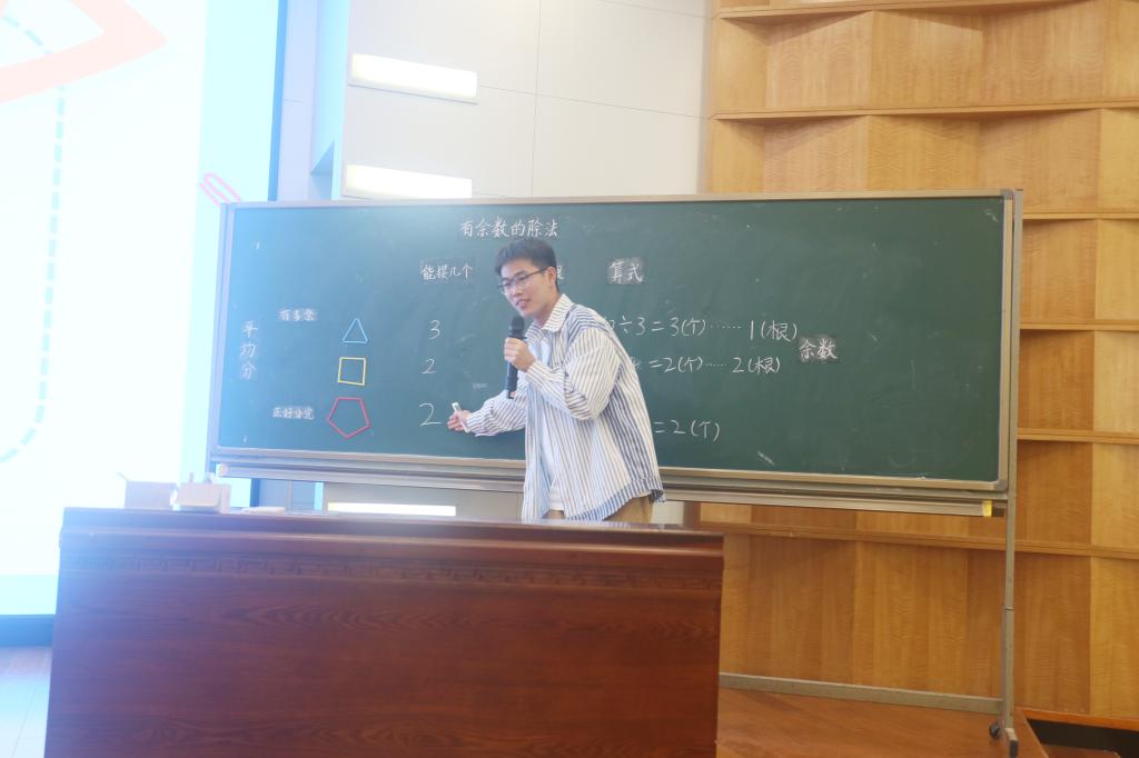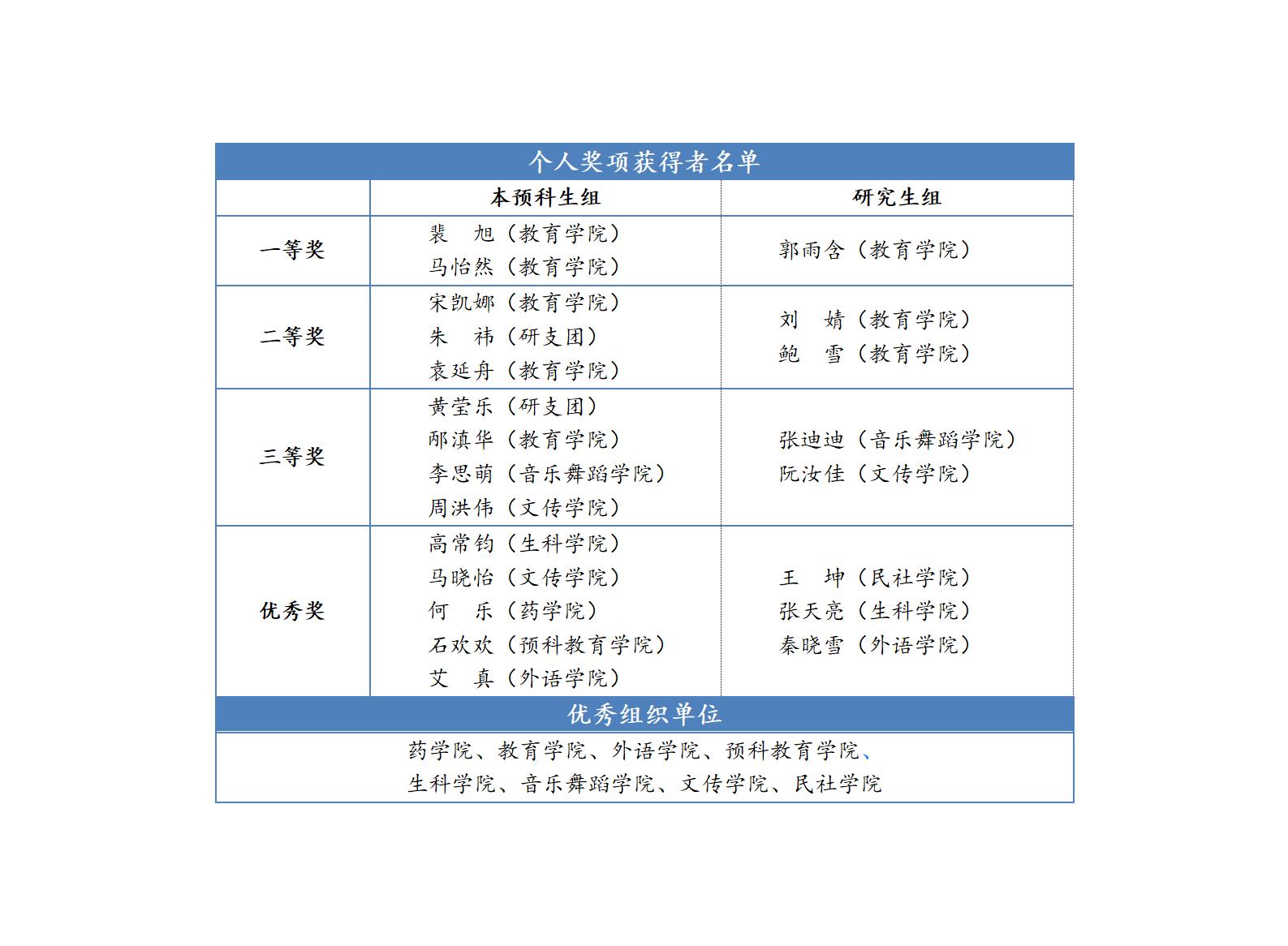 决赛共分上下两场,上半场为本预科生比赛专场,下半场为研究生比赛专场。22位参赛选手选题突出专业特色,以独特的教学设计、流畅的讲课过程和灵动的语言表达在短短的8分钟里展现了教学的新思路和新方法,呈现出了良好的课堂效果。教学内容丰富多彩,涉及小学、初中、高中多学段,《有余数的除法》《盘古开天地》《认识时间》《情绪万花筒》《水循环》《细胞核的结构和功能》《多彩的乡音》等课堂涵盖语文、数学、英语、音乐等多学科知识。最终,裴旭、马怡然获本预科生组一等奖,郭雨含获研究生组一等奖。