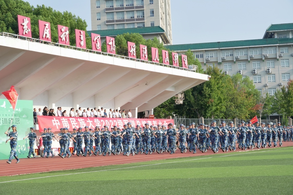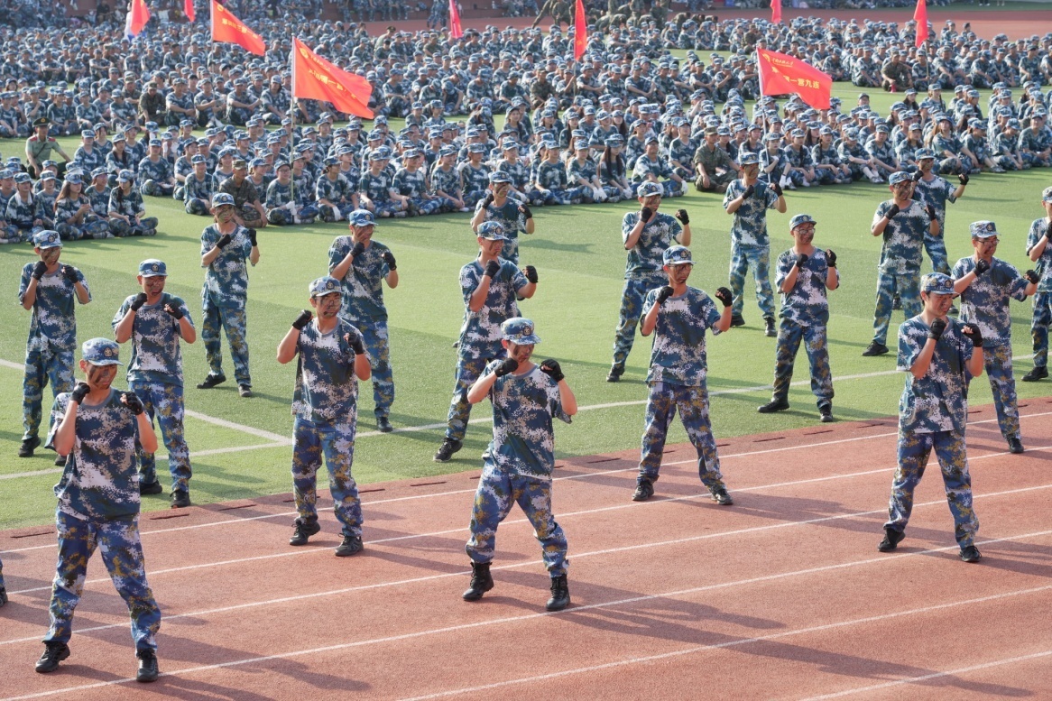 在庄严雄壮的国歌声中,五星红旗冉冉升起,全体参会人员面向国旗行注目礼。2022级学生组编成5个营47个连进行汇报表演。整齐划一的方阵步伐,嘹亮高亢的口号喊声,展现了同学们的训练成果和飒爽英姿。方队汇报结束后,擒敌拳、匕首操和教官方阵的擒敌术表演将大会推向高潮。男子擒敌拳方阵在教官的号令下迅猛出拳,行云流水又刚强有力的动作诠释了男儿自强的饱满精神与自信昂扬。女生方阵的匕首操一招一式皆刚柔并济,无不体现着“巾帼不让须眉”的四溢神采。教官方阵的表演则展现了中国军人的矫健身姿和凛然伟岸。