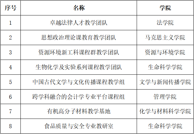 必赢官网卓越法律人才教学团队、思想政治理论课教育教学团队、资源环境新工科课程群教学团队、生物化学及实验系列课程教学团队入选省级教学团队,中国古代文学与文化传播课程教学组、跨学科融合的会计学专业平台课程组、有机高分子材料教学基地和食品质量与安全专业教研室入选优秀基层教学组织。