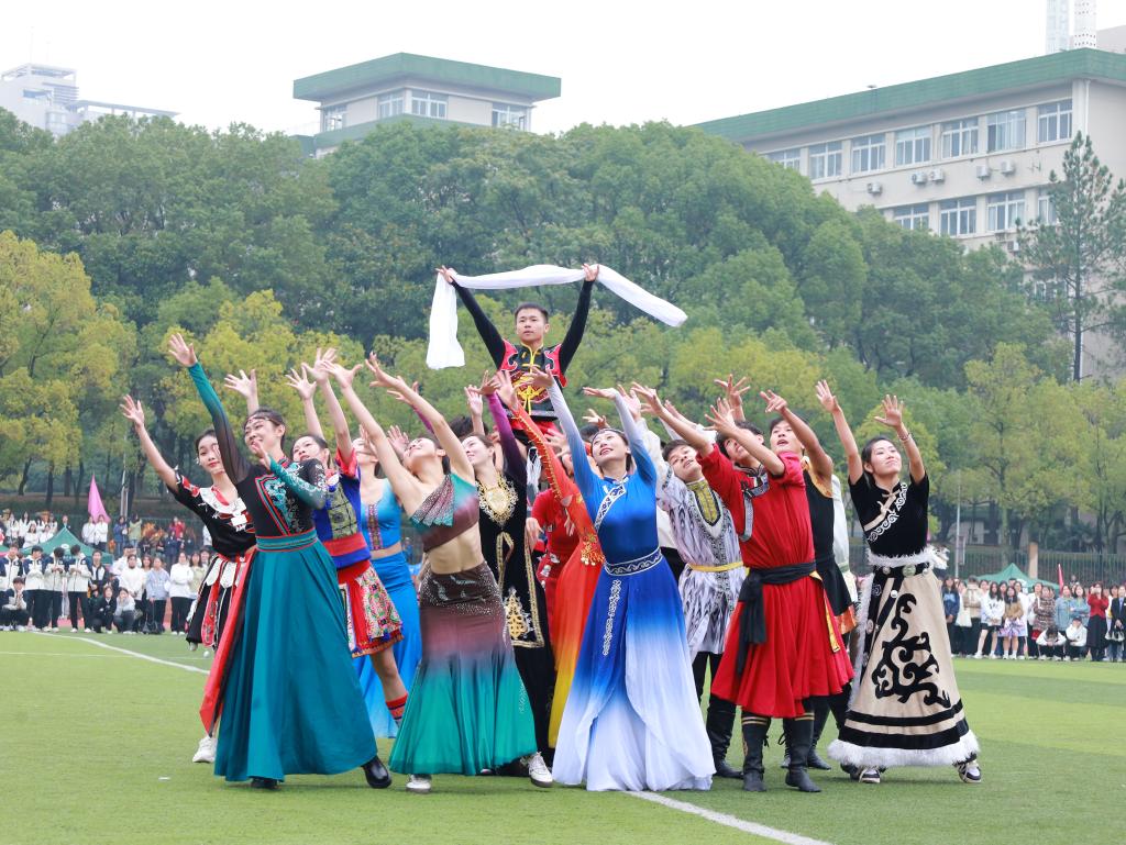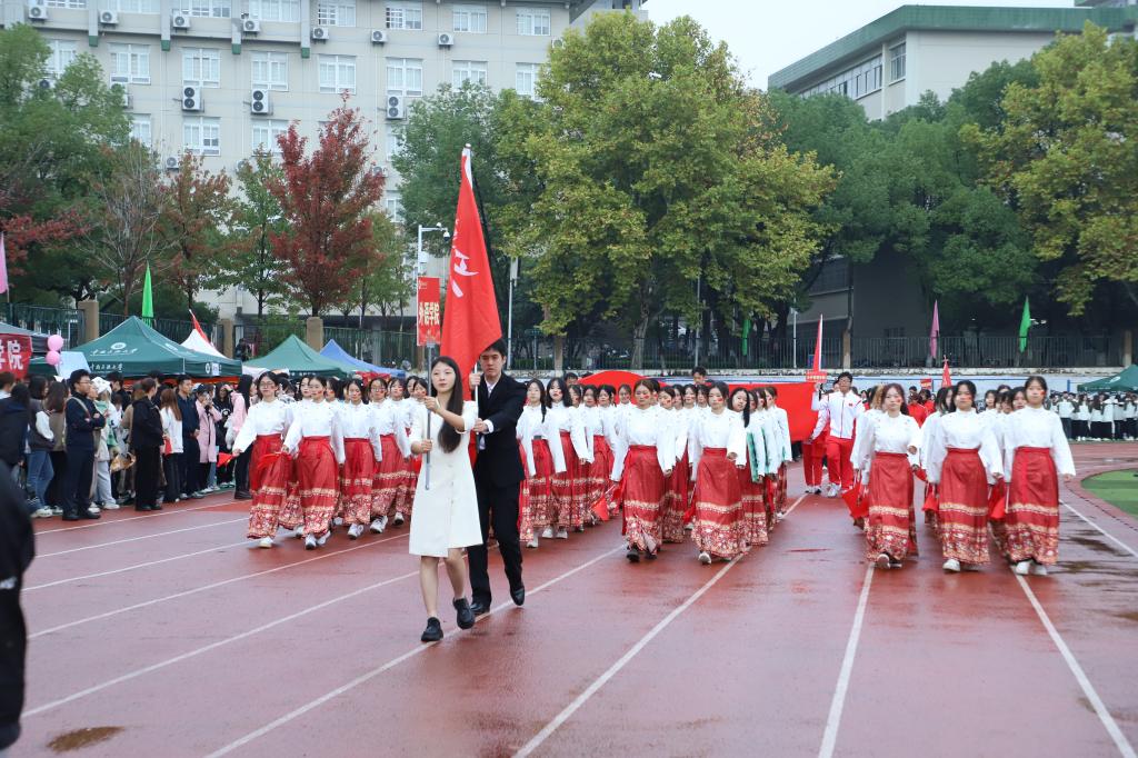 国旗仪仗队护送国旗率先登场。伴着激昂的运动员进行曲,各学院和教工方阵队迈着整齐的步伐,依次入场。文学与新闻传播学院同学身着汉服,手持“文以载道,传以致远”的卷轴,驻停舞蹈优美典雅;音乐舞蹈学院同学身着院服,伴着鼓点翩翩起舞,展现专业水准;外语学院同学高举国旗迎风招展,鲜艳的中国红引燃现场气氛;国际教育学院同学齐打武术,一招一式间展现中外交流气象……整齐的步伐与精彩的驻停表演赢得了阵阵掌声与欢呼声。