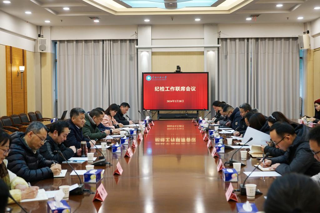 2月28日,学校2024年第二次纪检工作联席会议在学术交流中心召开,传达学习习近平总书记在中央全面深化改革委员会第四次会议上的重要讲话精神,中央纪委国家监委驻中央统战部纪检监察组与各综合监督单位2024年第一次纪检监察工作联席会议精神,湖北省纪委十二届三次全会精神。校党委常委、纪委书记韩叶盛主持会议,校纪委委员、各基层纪委书记、纪委办公室全体干部参加了会议。