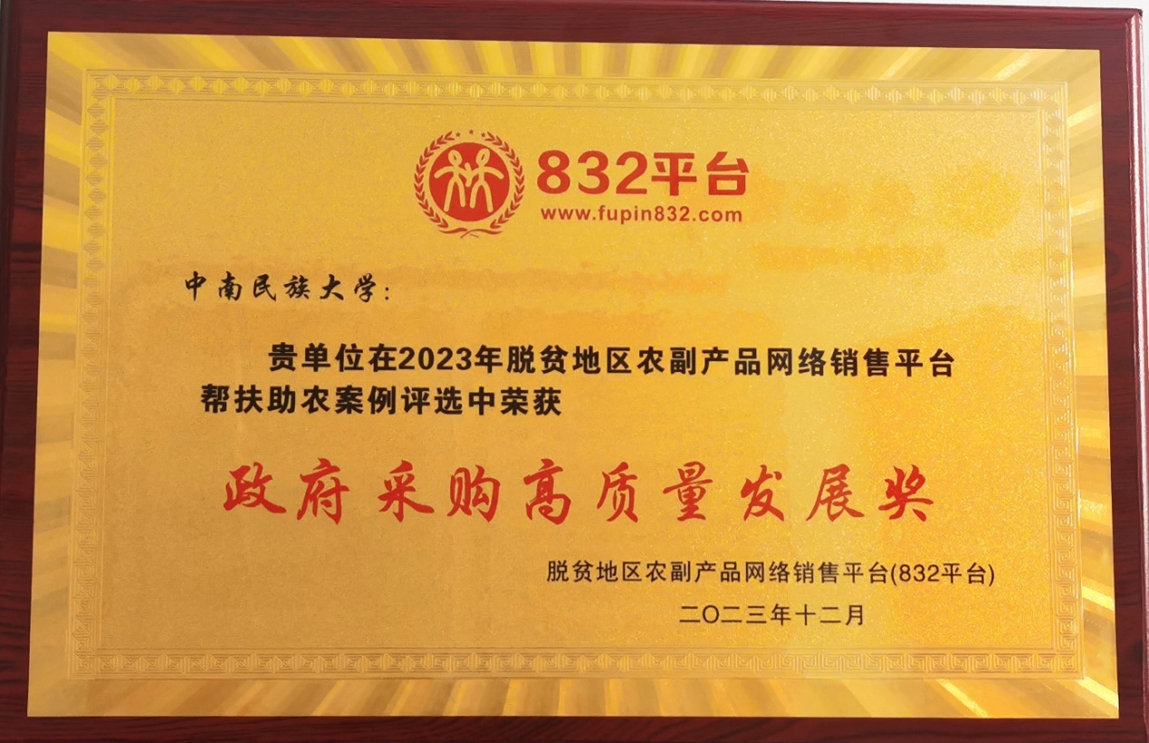 开学初,必赢官网收到脱贫地区农副产品网络销售平台(832平台)颁发的奖牌。在2023年脱贫地区农副产品网络销售平台帮扶助农案例评选活动中,必赢官网荣获“政府采购高质量发展奖”。