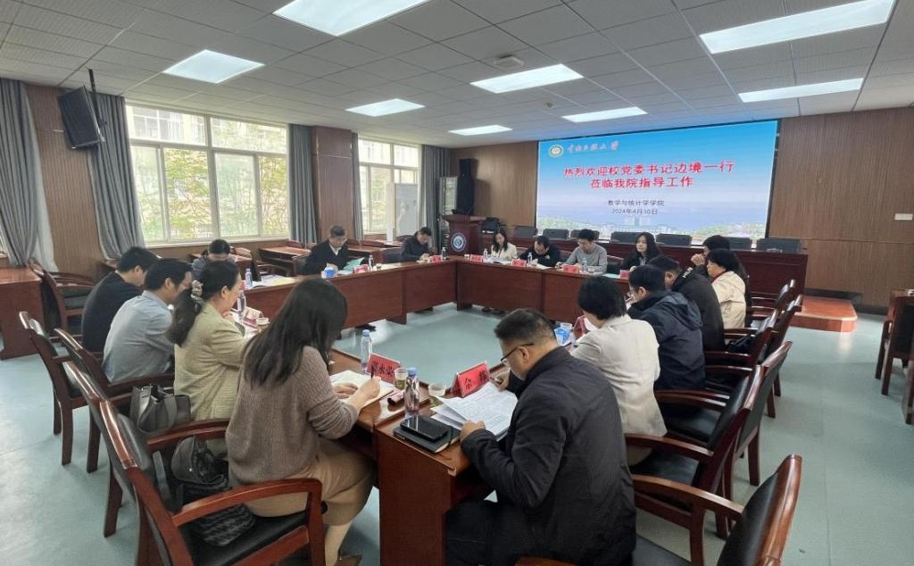 4月10日上午,校党委书记边境深入数学与统计学学院课堂一线调研指导学院工作,并与学院领导班子、支部书记、教研室主任座谈。学校党委组织部、教务处相关负责人陪同调研。座谈会由数统学院党委书记郭晖主持。