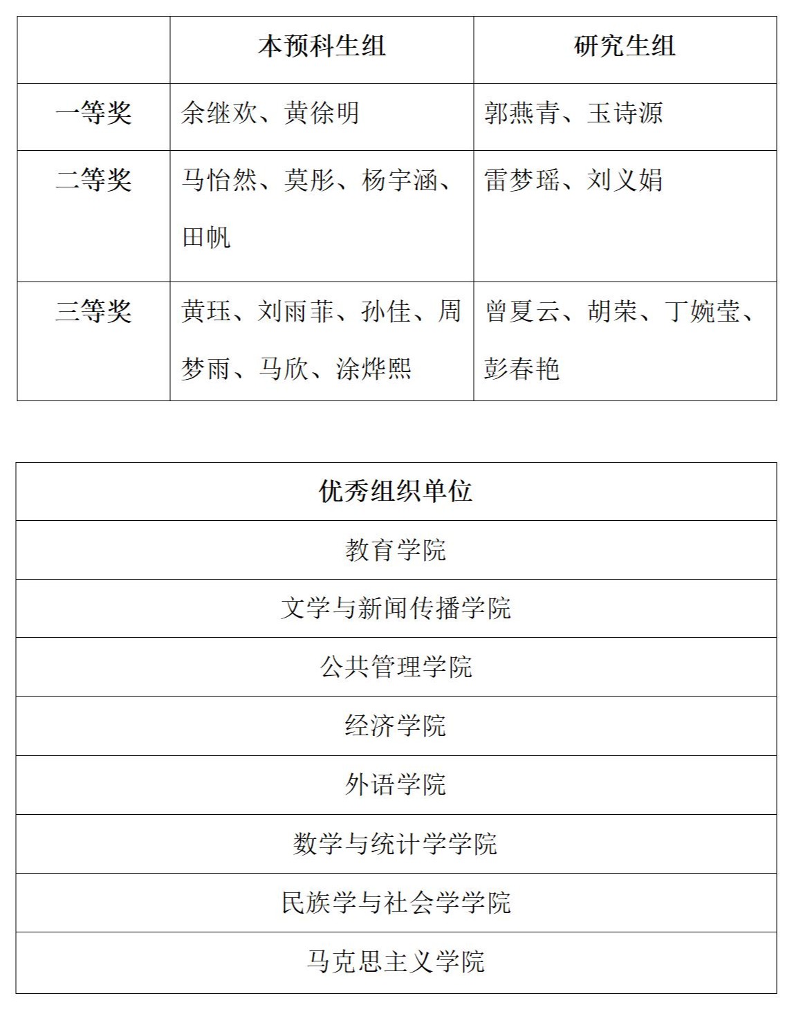 决赛共分上下两场,上半场为本预科生比赛专场,下半场为研究生比赛专场。20名参赛选手在短短的8分钟里充分展现了自己的教学水平和创新能力。教学内容丰富多彩,涉及小学、初中、高中多学段,《走月亮》《光合作用原理》《五四运动》《勾股定理》《力的合成与分解》《绣红旗》《秋天的雨》等课堂涵盖语文、数学、物理、历史、音乐等多学科知识。最终,余继欢、黄徐明获本预科生组一等奖,郭燕青、玉诗源获研究生组一等奖。