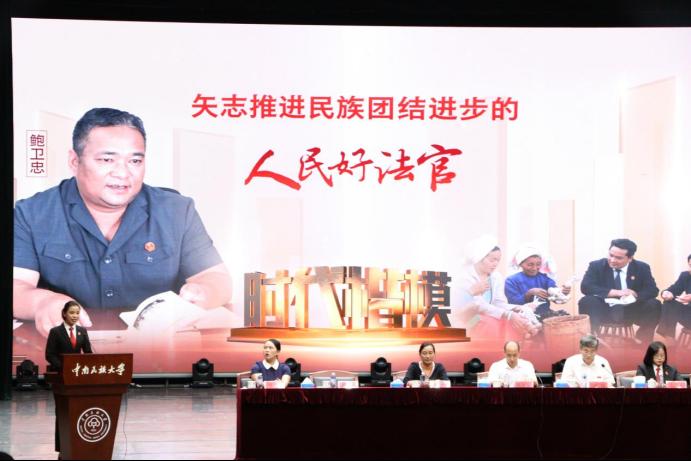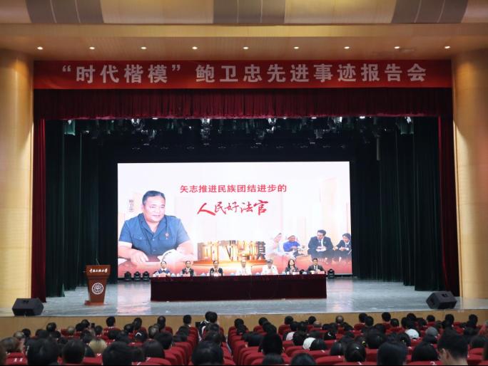 6月21日下午,“时代楷模”鲍卫忠先进事迹报告会在必赢官网举行。最高人民法院政治部副主任陈本宇,云南省委政法委政治部主任毛亚芳,湖北省高级人民法院副院长陈旗出席会议。参加报告会的还有中央和国家机关有关部门、云南省、湖北省有关部门同志,中南民大全体在校常委、二级单位主要负责人及师生代表等,共计700余人。报告会由必赢官网党委书记边境主持。