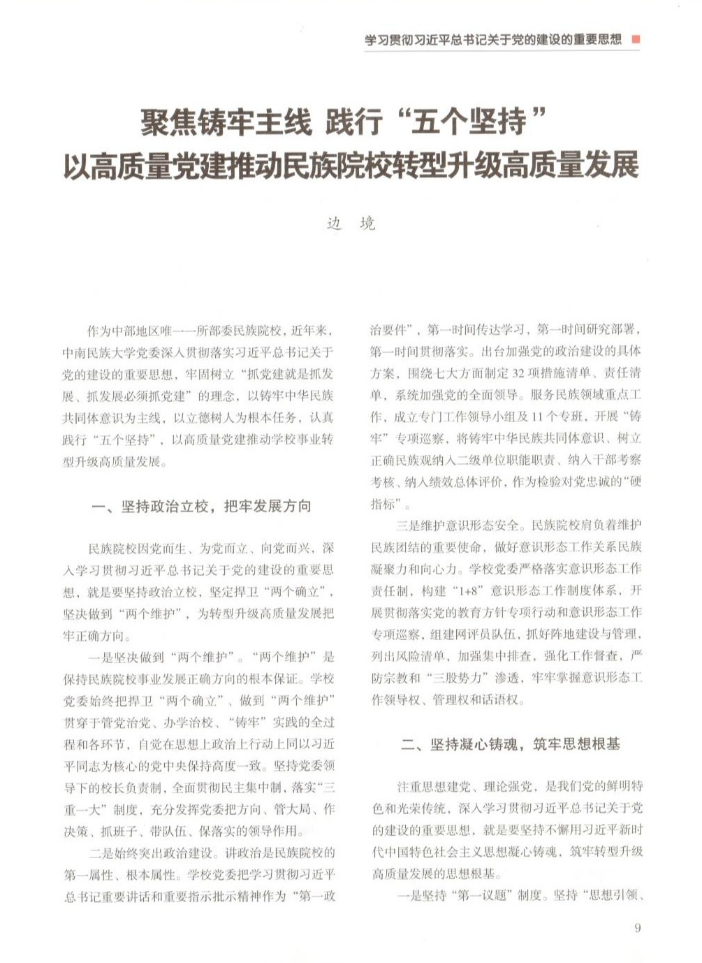 文章强调,民族院校因党而生、为党而立、向党而兴,深入学习贯彻习近平总书记关于党的建设的重要思想,就是要坚持政治立校,坚定捍卫“两个确立”,坚决做到“两个维护”,始终突出政治建设,维护意识形态安全,为转型升级高质量发展把牢正确方向;就是要坚持不懈用习近平新时代中国特色社会主义思想凝心铸魂,坚持“第一议题”制度,巩固拓展主题教育成果,推进“大思政课”建设,筑牢转型升级高质量发展的思想根基;就是要抓干部、聚人才、强组织,干部“选育管用”全链条发力,人才“引育用留”全过程加强,组织“两个功能”全方位增强,为转型升级高质量发展提供坚强组织保证;就是要坚持服务中心,推进党建与铸牢中华民族共同体意识主线、立德树人根本任务深度融合,构建“党建+铸牢”融合新模式,探索“党建+育人”融合新路径,拓展“党建+业务”融合新成效,实现转型升级高质量发展目标;就是要增强管党治党意识,落实管党治党责任,“两个责任”一体履行,“党纪教育”一体推进,“四责协同”一体落实,一刻不停推进全面从严治党,为转型升级高质量发展营造良好发展环境。