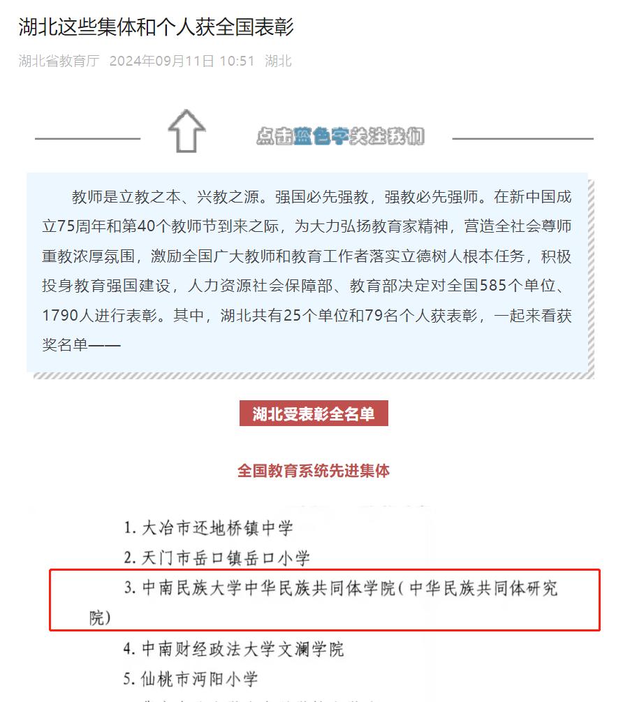 据悉,本次表彰旨在大力弘扬教育家精神,营造全社会尊师重教浓厚氛围,激励全国广大教师和教育工作者落实立德树人根本任务,积极投身教育强国建设,全国共有585个单位、1790人进行表彰,湖北共有25个单位和79名个人获表彰。