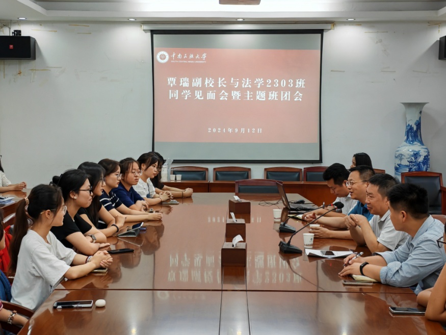 9月12日下午,校党委常委、副校长覃瑞与其联系的班级法学院2303班同学见面,并作党的二十届三中全会精神和铸牢中华民族共同体意识宣讲。法学院党委书记邓行、党委副书记姜珍、2023级学生辅导员以及法学院2303班全体同学参加。