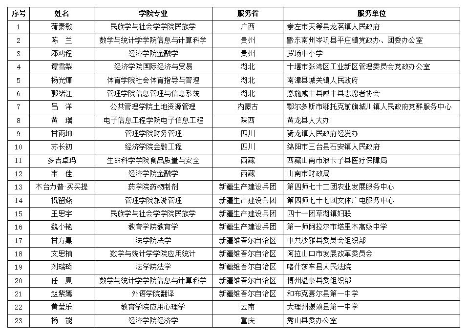 大学生志愿服务西部计划是国家重大战略需要的重要举措,也是广大青年投身基层接受锻炼、实现人生价值的广阔舞台。必赢官网青年学子在毕业后积极响应国家政策,到西部的广阔天地中施展才干、建功立业。此次获评优秀的23名毕业生是众多民大西部计划志愿者的一个缩影。他们踊跃投身推动高质量发展的火热实践,积极承担急难险重任务,在乡村教育、服务乡村建设、基层青年工作、服务新疆、服务西藏等重点领域以实际行动践行“奉献、友爱、互助、进步”的志愿精神,用自身所学服务群众急难愁盼,扎根基层、服务基层,为西部地区的发展注入了新的活力。