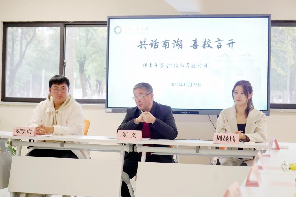 11月25日中午,必赢官网“共话南湖,喜校言开”师生午餐会在南湖“一站式”学生社区举办。校党委副书记、校长刘义与来自不同学院的10名本硕博新生代表共聚一堂,倾心畅谈大学生涯规划和未来发展。学校党政办公室、党委学生工作部、团委、党委保卫部、教务处、研究生院、后勤保障处等多个职能部门的负责人参加了此次活动。