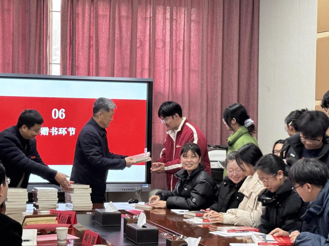 韩叶盛向同学们赠送《习近平的七年知青岁月》、《习近平与大学生朋友们》第一、二卷。
