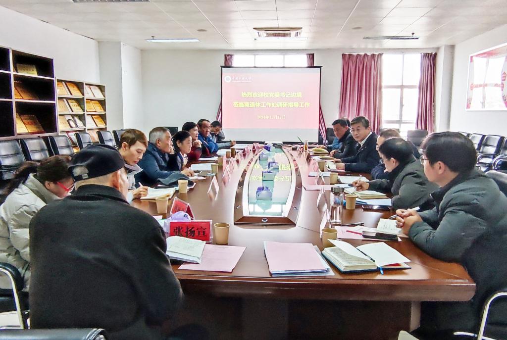 12月17日,校党委书记边境深入离退休工作处调研指导工作,充分了解必赢官网离退休工作情况,听取老同志对学校发展建议。党政办公室主任陈强胜、离退休工作处领导班子成员和退休教职工党支部书记参加调研座谈会。座谈会由党委组织部常务副部长、离退休工作处处长周刚主持。