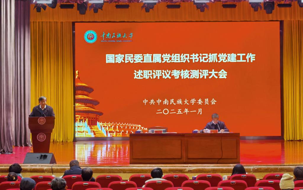 1月7日下午,按照国家民委党组、湖北省委关于2024年度考核工作的统一部署,学校召开司局级领导班子及成员2024年度综合述职考核测评大会暨国家民委直属党组织书记抓党建工作述职评议考核大会。国家民委机关党委领导、校党委常委、其他校“两委”委员、各二级单位主要负责同志、其他正处级干部、正高级职称专业技术人员、教代会代表、“两代表一委员”参加会议。会议由校党委副书记、校长刘义主持。