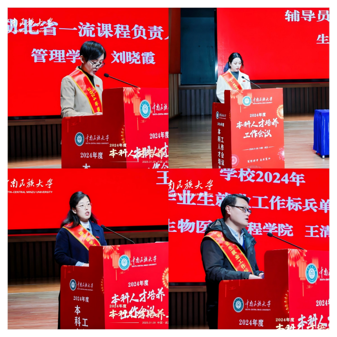 会上,管理学院刘晓霞老师代表湖北省一流本科课程负责人分享了《会计信息系统》课程教学改革的典型经验。生命科学学院李茜老师作为第十一届湖北省高校辅导员素质能力大赛二等奖获奖者介绍了学生思想政治教育的创新思路与实践成果。实验教学与工程训练中心、创新创业学院王蕾老师代表国家级学科竞赛优秀指导教师分享了带领学生参加学科竞赛的成功经验。生物医学工程学院党委副书记王清华代表学校2024年毕业生就业工作获奖单位介绍了生医学院上下联动、统筹推进毕业生高质量就业的工作举措。