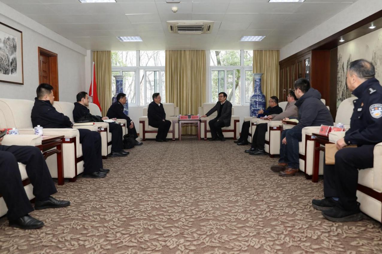 2月24日下午,武汉市公安局东湖新技术开发区分局局长蒋学敏带领警务指挥处、国保大队、交通大队、铁箕山派出所负责人来校调研座谈。校党委书记徐业勤,党委副书记、校长刘义,党委常委、副校长李红燕,党政办公室、党委保卫部、党委学生工作部负责人参加会议。