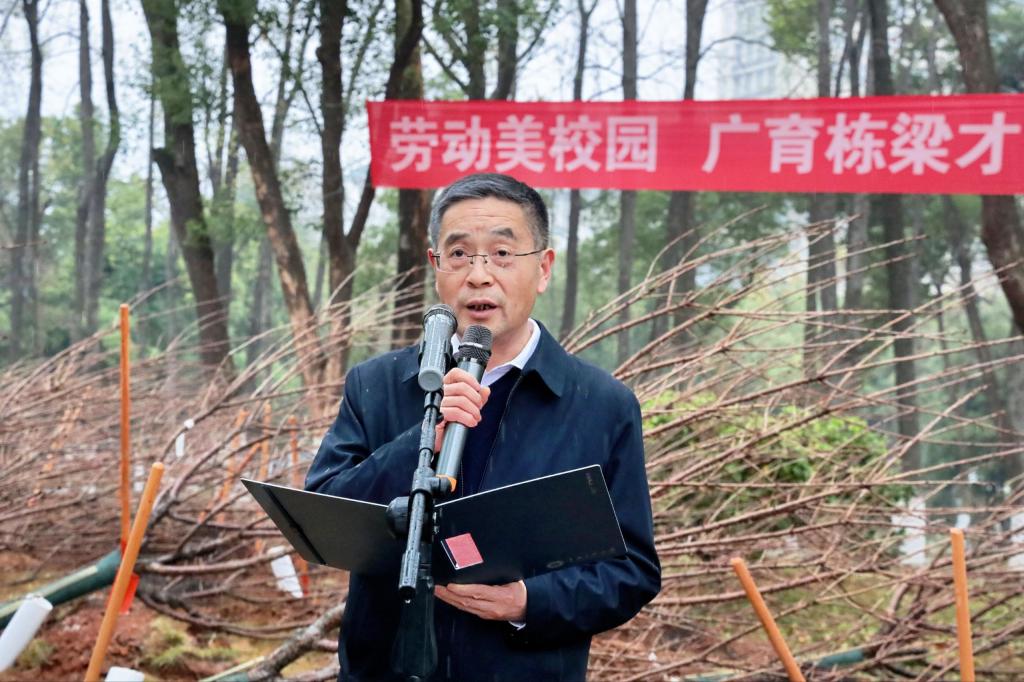 校党委副书记、校长刘义致辞。他说,青年大学生是祖国的未来,也是生态文明建设的重要力量。今天的植树活动,不仅是一堂劳动实践课,也是一堂生态教育课。全校师生要将“绿水青山就是金山银山”的理念内化于心、外化于行,共同绘出美丽民大的时代新画卷。他指出,我们今天在此栽下新苗,为石榴树施肥培土,就是要在青年学子心中播下“民族团结”的种子,引导大家牢固树立“休戚与共、荣辱与共、生死与共、命运与共”的共同体理念,努力成为铸牢中华民族共同体意识的坚定拥护者、有力宣传者和忠实实践者。