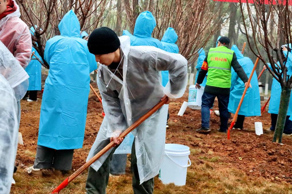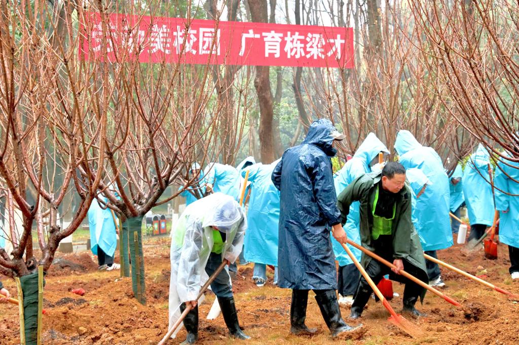 春雨中,师生们共同栽培樱花树、浇灌石榴园。大家分工协作,挖坑、扶苗、培土、浇水,现场一片热火朝天的景象。很快,新栽的树苗在春风中挺立,为校园又增添了一抹生机。
