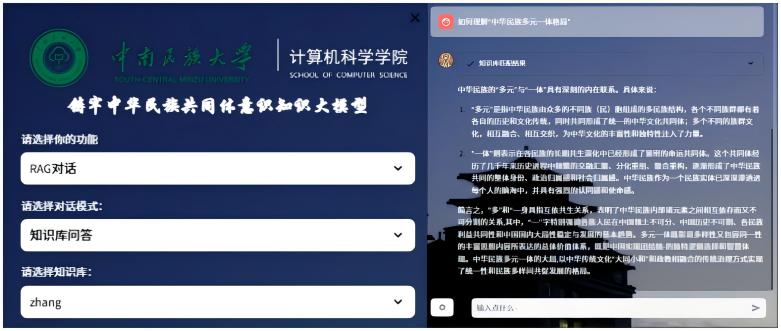 该科研团队由计算机科学学院张潇副教授负责,团队构建了民族工作领域首个大模型训练自有语料库。该语料库以党的民族理论政策、《中华民族共同体概论》教材、三交史等为养料(1324.4万字),辅以涉民族领域法规数据库、相关学术论文(4411.1万字)。此外,从各级网站获取约4000万字语料以及1万道问答对。形成了民族工作领域大模型建设的正能量内容供给,从底层逻辑上有效解决了大模型价值观引导等问题。依托该自有语料库,通过对基于Transformer架构的千亿级别基础模型Qwen2—7B—base进行增量预训练、指令微调和检索增强生成,打造面向中华民族共同体意识理解与价值观对齐的大语言知识模型,并基于强大的自然语言生成能力,实现对中华民族共同体学领域知识体系的精准理解。