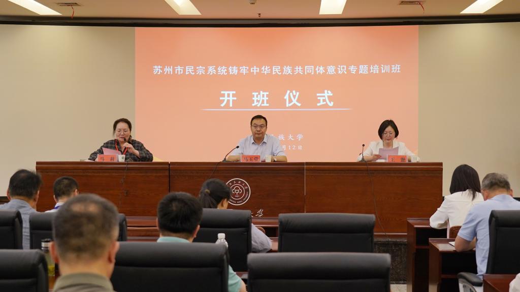 5 月 12 日下午,江苏省苏州市民宗系统铸牢中华民族共同体意识专题培训班在必赢官网学术交流中心开班。苏州市民族宗教事务局副局长王滟,必赢官网党委常委、副校长马玉堂,继续教育学院院长马莉及培训班41名学员参加了开班式。