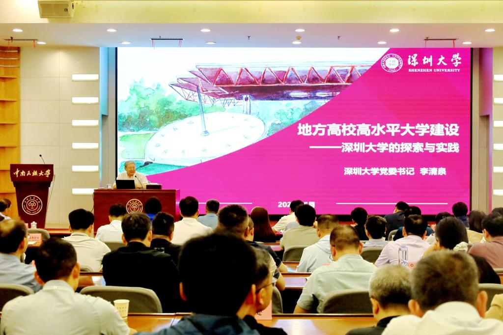 会议邀请了深圳大学党委书记、中国工程院院士李清泉教授作专题辅导报告。报告结合深圳大学的实践和探索,围绕“为什么要建设高水平大学”“建设什么样的高水平大学”“怎样建设高水平大学”“高水平大学建设的成效”“干部党性修养与能力提升”等5个方面,深入系统阐述了高水平大学建设的深刻内涵、目标要求和实践路径。报告介绍了深圳大学伴随经济特区而生,伴随改革开放而兴,零起点兴办大学的高等教育创新发展历程,全面展示了党的十八大以来深圳大学深度融入先行示范区建设,以全球广度、中国高度、深圳速度,实现从“教学型”向“教学科研并重型”战略转型,加快建设世界一流综合大学的建设成效。报告指出,高素质干部队伍是一流大学建设的重要基础,高校干部特别是领导干部要加强党性修养,强化战略思维,提升管理能力,坚守廉政底线。