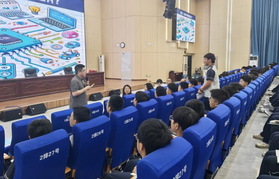 崔勇强以《芯片的奥秘》为题,生动解析半导体技术链与产业前沿。他结合卫星遥感、智能终端等案例,深入浅出讲解“何为芯片”“为何芯片”及“芯片何为”,引导学生理解对“卡脖子”难题进行技术攻坚的紧迫性,激发学子科技报国志向。他以“常见的传感方式有哪些”“如何实现二进制加法”等问题与学生互动,学生们以大胆的想象力、表现力及扎实的学习力积极作答,现场气氛十分热烈。恩施州高级中学高一24班陈瑞雪同学说道:“崔教授的讲座让我明白,芯片不仅是电子元件,更是大国博弈的战略支点。我希望自己以后也能够从事与芯片相关的研究,为我国科技自立自强贡献自己的一份力量!”
