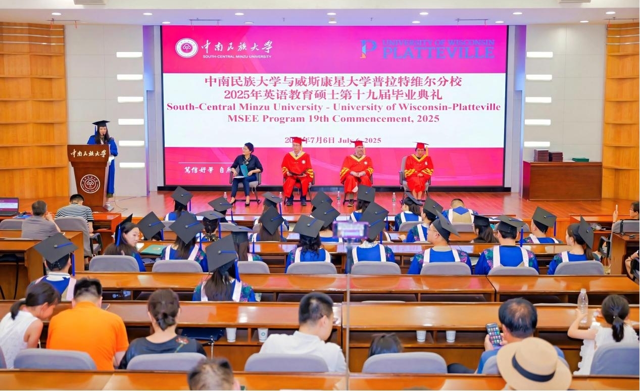 7月6日上午,学校与威斯康星大学普拉特维尔分校合作举办的英语教育硕士项目第十九届学生毕业典礼暨学位授予仪式在学术交流中心举行。校党委常委、副校长方德斌,威斯康星大学普拉特维尔分校副教务长David Gillota、项目协调员Yuanyuan Hu教授,国际合作与交流处相关负责人参加毕业典礼。