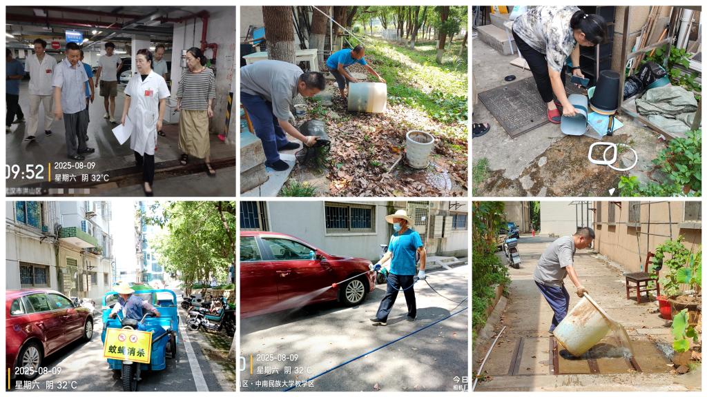 8月9日,校医院、后勤保障处、社区居委会等多部门开展校园环境整治专项行动,重点推进“翻盆倒罐清积水”及灭蚊消杀工作,全力切断蚊虫孳生链,有效预防基孔肯雅热等蚊媒传染病传播,保障师生员工及社区居民的健康安全。