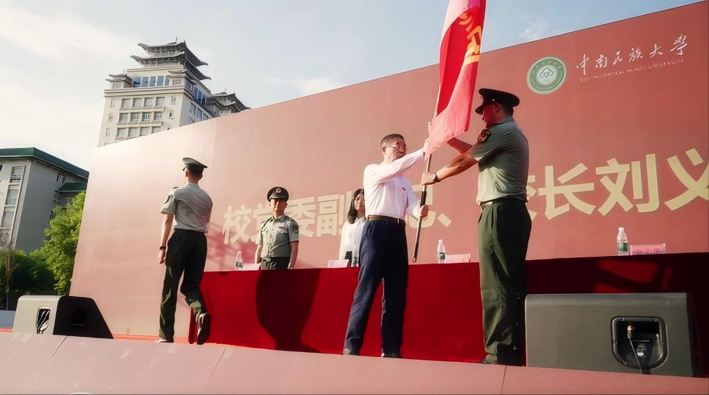 校党委副书记、校长刘义代表学校向军训团授旗,标志着2025级本科生军训正式启动。