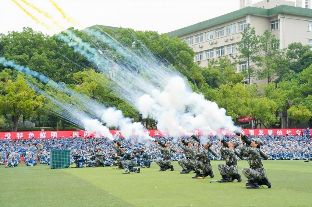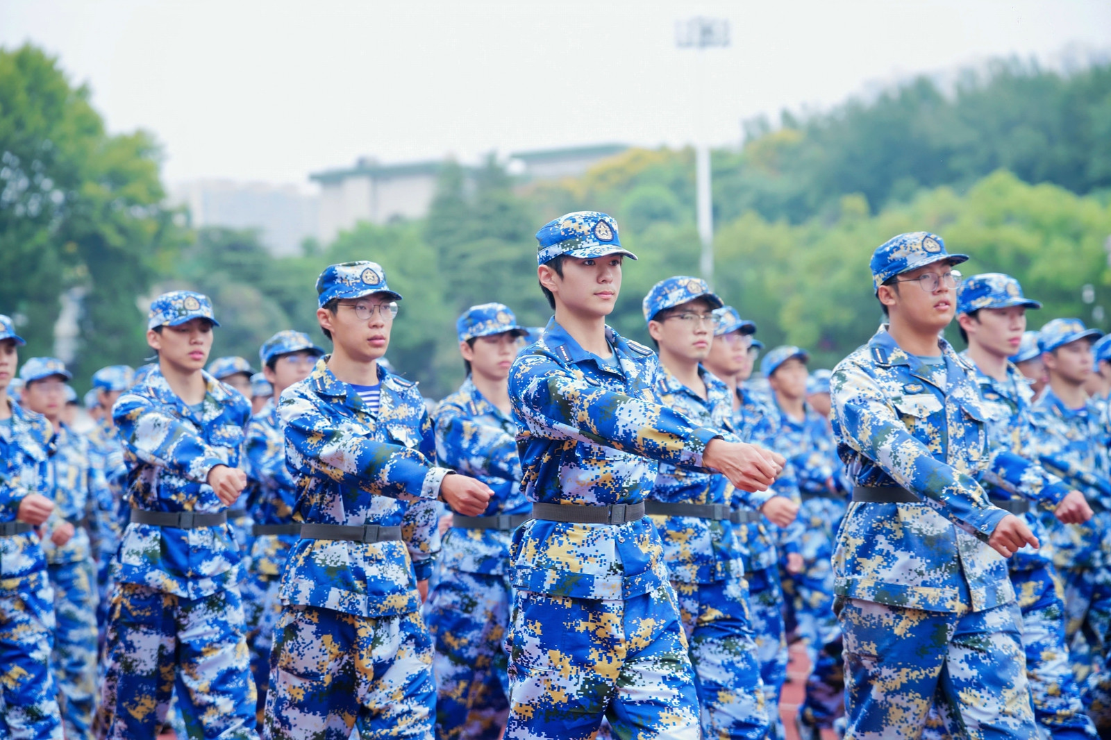 在极具感染力的滚动排字表演中,1200名参训学子依次展示出党徽、“纪念抗战胜利80周年”、“正义必胜、和平必胜、人民必胜”、校徽以及校训“笃信好学,自然宽和”等字样。他们动作整齐划一,默契配合,依次传递,最终共同展开一面鲜红的五星红旗,并庄严许下“请党放心,强国有我”的青春誓言。随后,刺杀操、匕首操、军体拳、红蓝对抗、队形变换等军事训练科目依次亮相。学员们动作刚劲有力、气势如虹,全面展现了为期两周的军训成果,赢得现场阵阵掌声。