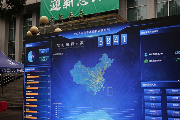 在学校迎新总站,一块电子大屏幕十分抢眼。大屏幕实时动态呈现新生报到各项数据,为各单位调配服务资源、保障迎新工作提供了大数据支持。同时,学校资助管理中心在新生到校前,利用迎新系统大数据进行分析,确定了家庭经济困难学生,为他们定制“爱心大礼包”,并送到宿舍床位上,新同学推开宿舍门即可感受到学校的暖心关怀。依托前置的心理健康教育测评系统,学校为新生提供线上心理测试服务,及时了解学生心理健康状况并开展心理健康教育。