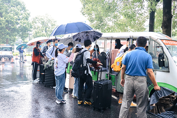 新生乘坐校园摆渡车前往宿舍。左云霄 摄