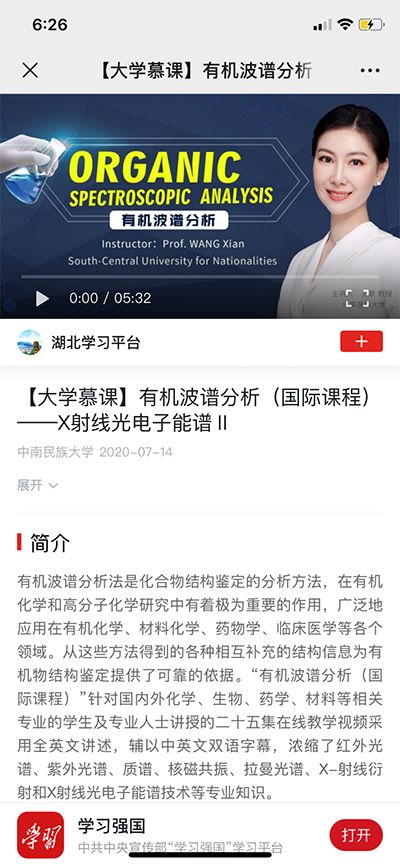 《有机波谱分析(国际课程)》共有25节,采用全英文讲授,辅以中英文字幕,并配以图片、动画和短视频。该课程内容涵盖了红外光谱、紫外光谱、质谱、核磁共振氢谱和碳谱、拉曼光谱、X-射线衍射、X-射线光电子能谱等主要的现代有机波谱分析技术,旨在引导学生了解关键科技信息并自主构建知识框架,观察科学现象和发现科学规律。其中,“质谱介绍”曾获得全国高校首届微课比赛决赛三等奖。线上课程设计还包括所有章节的英文PPT课件、习题、热点讨论等,有助于学生课前预习、课后复习,训练综合思考能力及逻辑思维。该课程已于7月3日上线“学习强国”湖北学习平台。