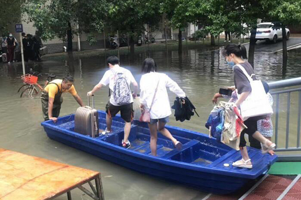 入梅以来,武汉市连日多雨,6月28日至29日上午,普降特大暴雨,毕业生返校路艰难而又温馨。29日,校党委副书记、副校长宋发军和学工部、校团委老师亲往火车站,迎接最后一批返校的毕业生。住北区学生公寓的同学自南区走过天桥,映入眼帘的是一条蓝色的小舟,后勤保障处的师傅挽舟涉水,送他们前往寝室。这是必赢官网防涝抗洪工作的一个缩影。