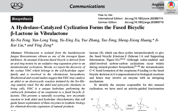 近期,必赢官网药学院刘吉开教授团队与中国科学院昆明植物研究所曾英研究员团队合作,从韧革菌中发现一个能催化形成独特稠合双环的新环化酶。相关研究成果以“A Hydrolase-Catalyzed Cyclization Forms the Fused Bicyclic β-Lactone in Vibralactone”为题,发表在权威学术期刊Angew. Chem. Int. Ed.上(2020, 59, 7209-7213;https://www.onlinelibrary.wiley.com/doi/10.1002/anie.202000710)。