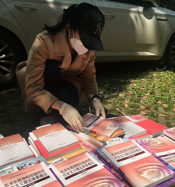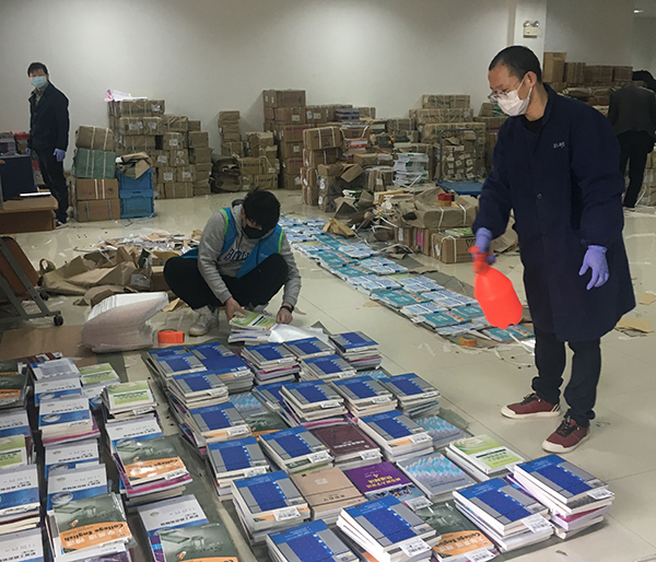 为准确、快速地将教材寄送至学生手中,教务处及各学院相关工作人员加班加点做好信息统计、核对工作。许多学院的党政领导、辅导员、教学秘书分期分批到现场进行核对。书商、快递公司和学院分工明确,各司其职,衔接有序地完成拣书、核对、消毒、装袋、打包、贴单、搬运等工作。