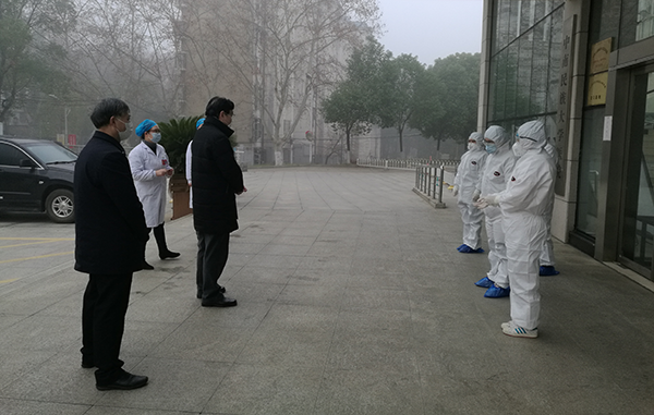 2月22日上午,由校医院尹伊湄医生和杨茉、周娟护士3人组成的医疗队在校医院门口集结,准备出征武汉市洪山区狮子山街集中隔离点。校长李金林,副校长赵晓珊到校医院为医疗队出征送行。