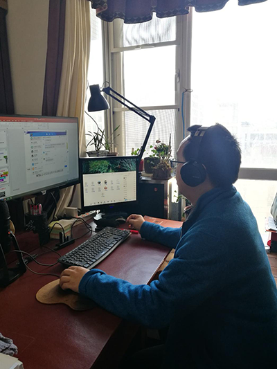 管理学院教师在家中准备课程、测试直播。教务处供图