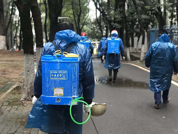 消毒是阻断新冠病毒传播的有效手段,始于1月26日的校园大面积消毒是后勤人的重要工作。食堂,每天早上消毒一次。垃圾堆放点、垃圾中转站,每天消毒一次。家属区、职工宿舍区电梯一楼大厅、重点场所公共卫生间,每天深度消毒两次,电梯每两个小时间隔喷雾消毒。家属区、职工宿舍区公共楼道、地下车库每3天深度消毒一次。配药,喷洒,擦拭,背式喷壶和小型喷洒车齐齐上阵,平均每天千余公斤的消毒液成为保障校园安全的一道屏障。