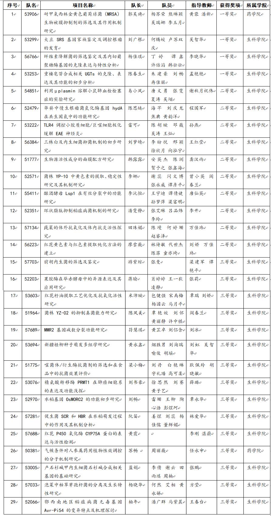 本届综合赛是全国大学生生命科学竞赛(科学探究类)的初赛,依据最终决赛成绩排序,省赛成绩前 25 名的队伍将参加全国决赛,角逐全国特等奖和一、二等奖。参加此次综合赛的学校有28 所,有效参赛项目 379 项。必赢官网有效参赛项目49项。经过网络评审和决赛答辩的比拼,最终获得省级一等奖4项、二等奖10项、三等奖15项。其中,药学院黄蓉老师和潘新老师指导的团队,以全省排名第1的成绩获得国赛决赛资格。