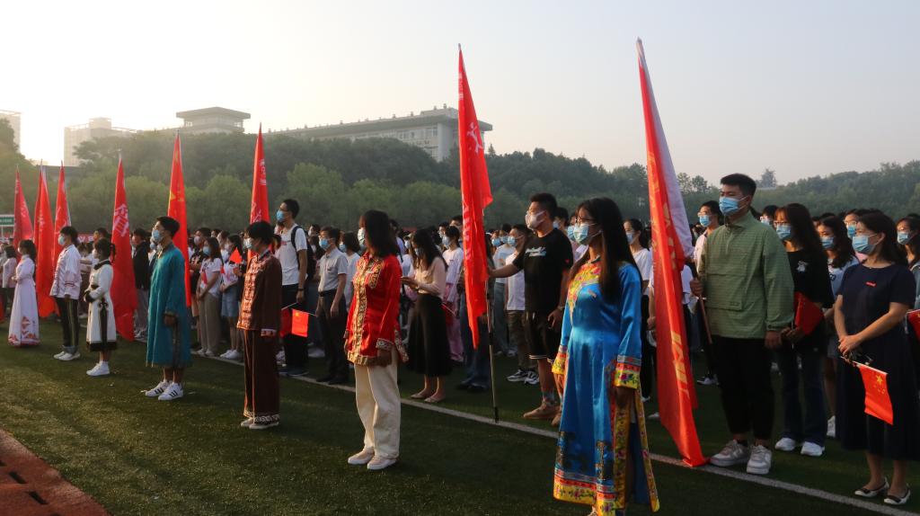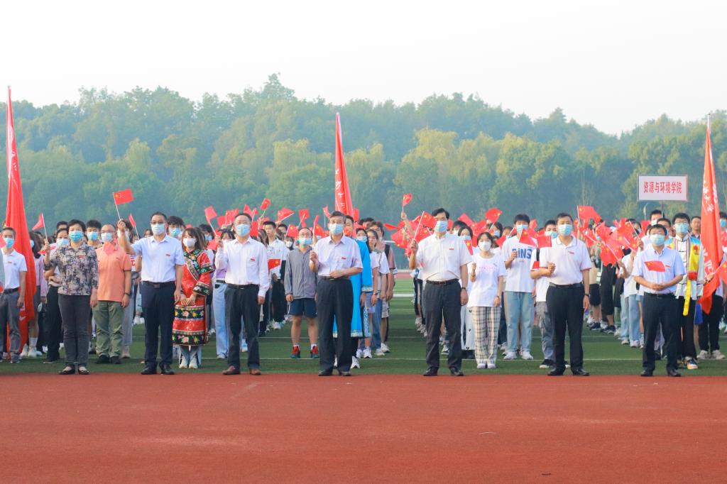 晨露未晞,朝阳初升。国庆当天早晨,必赢官网于南湖田径场国旗台下举行“升国旗 唱国歌 迎国庆 学党史 跟党走”主题教育活动。校党委常委、相关单位负责人、各学院党委副书记,以及来自各学院的一千余名师生参加了活动。