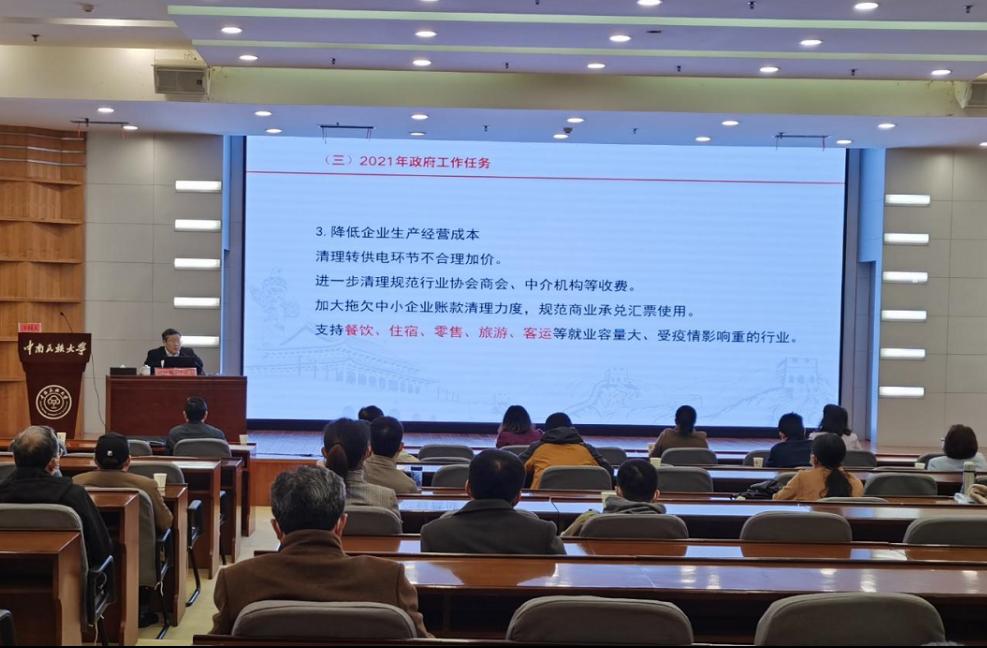 3月31日,学校举行统一战线学习贯彻全国两会精神宣讲报告会,邀请民进湖北省委会副主委、全国政协委员、省政府参事、湖北省社会主义学院院长胡仲军作专题辅导报告。各民主党派和统战团体负责人及教师代表到场听讲,校党委统战部常务副部长唐光海主持报告会。