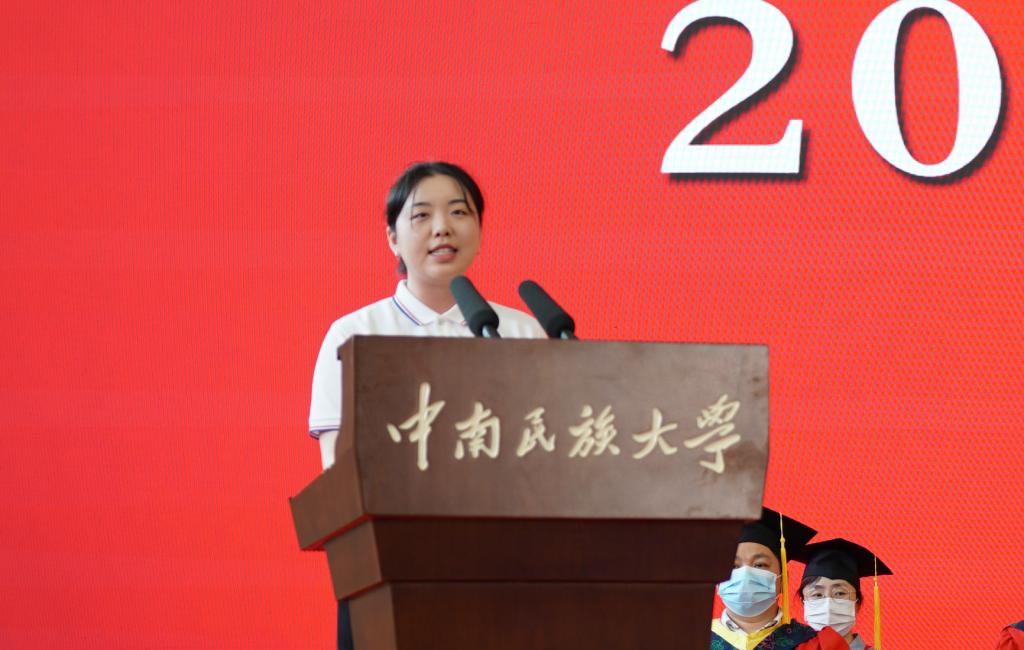 博士学位获得者代表民社学院王航、硕士学位获得者代表化材学院米晓茜分别发言。他们分享了自己在民大的求学经历,感谢母校提供了优质的成长平台,并表示将在今后的学习生活中不负母校和师长的厚望,不改初心,砥砺前行。