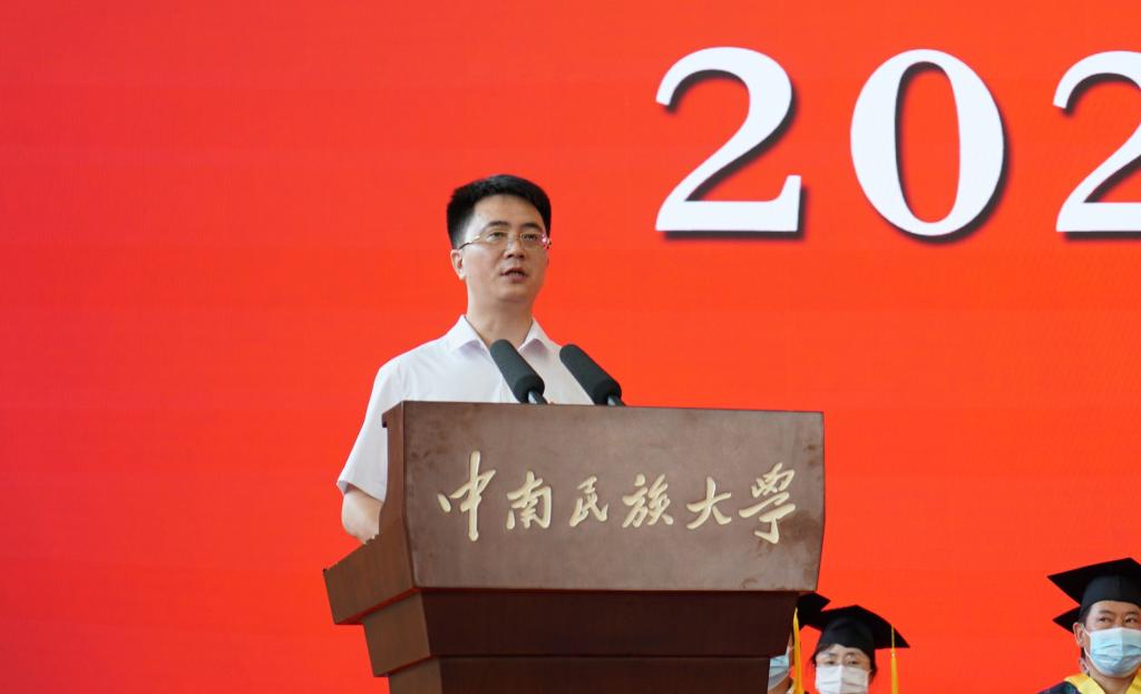 在热烈的掌声中,校长李金林发表讲话,寄语毕业生青春赛道逐梦跑,不负美好向未来。他首先代表学校向顺利完成本科学业的同学们表示热烈的祝贺,向辛勤培育同学们的父母和老师致以衷心的感谢。他说,2021年我们共庆建党百年,同时迎来建校70周年。2022年恰逢建团百年,党中央对青年寄予殷切期望,民大学子闻令而动、整装待发,矢志勇当改革闯将,谱写青春壮丽华章。