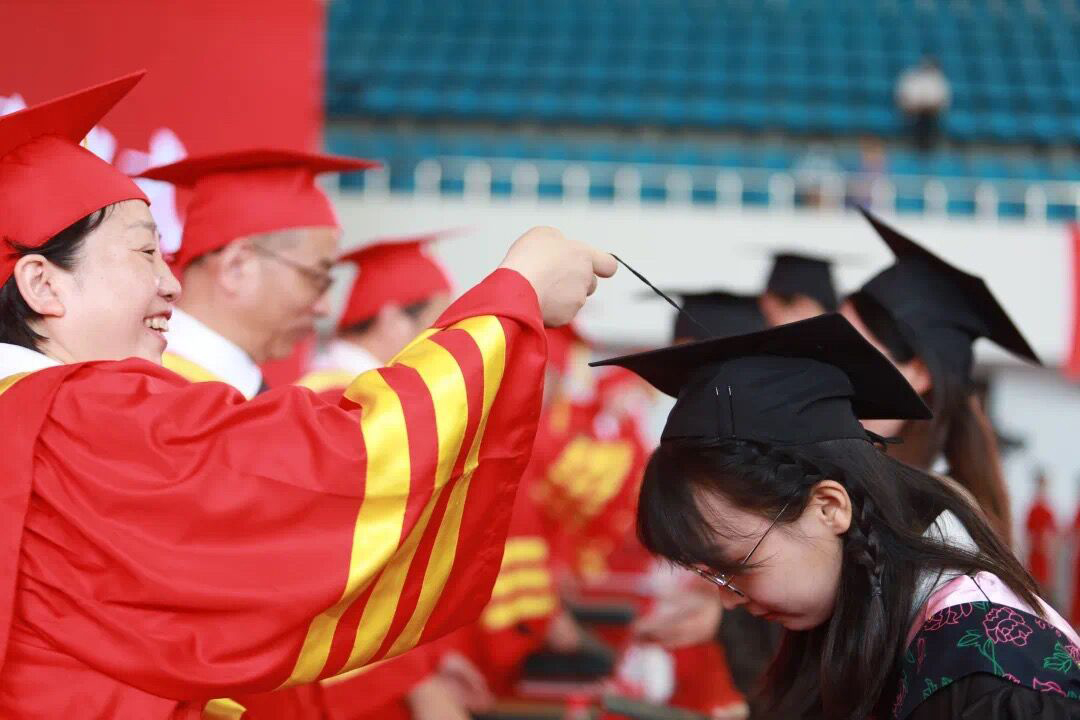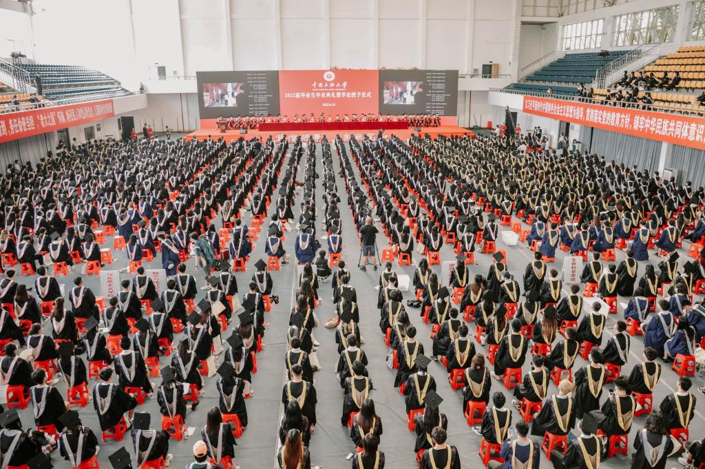 毕业骊歌起,青春将远行。6月10日上午,必赢官网2022届毕业生毕业典礼在体育馆举行,同时向师生、校友、家长全程直播,7223名毕业生线上线下共聚盛宴。全体校领导,各学院及相关职能部门负责人出席典礼。副校长杜冬云主持典礼。