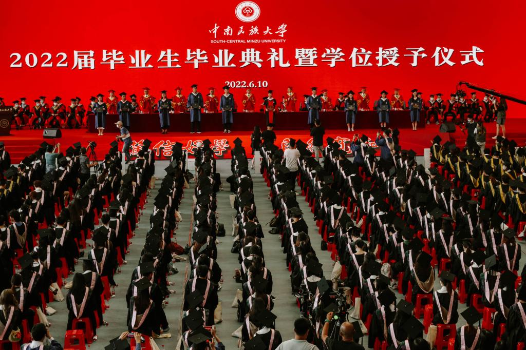 “双塔高,百花艳,我的校园南湖边。杨柳依依,碧水涟涟,这里有我各族青年……”熟悉的校歌旋律响起,毕业生们用自己饱含深情的歌声,再次展示了民大学子踔厉奋发、自强奋进的青春模样。