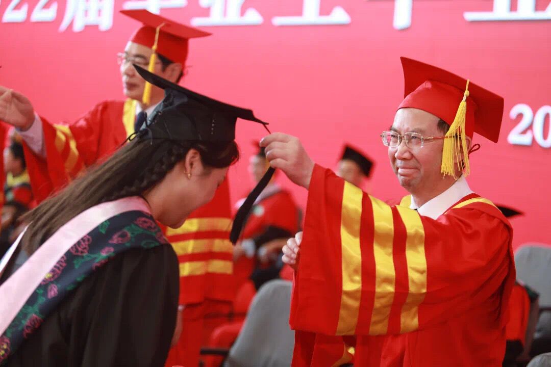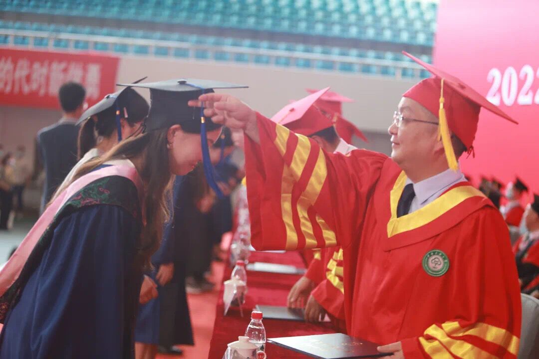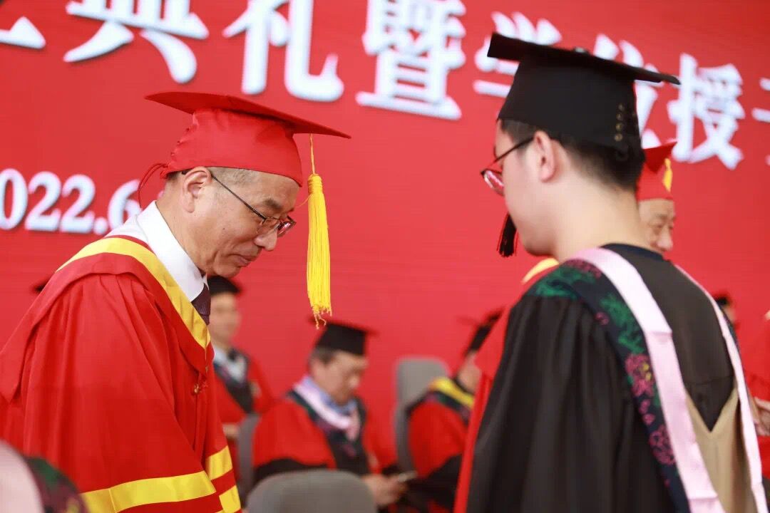 随后,校党委副书记、副校长宋发军宣读了《关于表彰2022届“优秀毕业生”的决定》《关于聘任2022届毕业生“年级校友理事”“校友联络员”的决定》。学校领导为毕业生代表颁发毕业证书,为“年级校友理事”“校友联络员”代表颁发聘书。学位评定委员会主席、副校长段超宣读学位授予文件,学校领导为毕业生代表行拨穗礼、颁发学位证书。