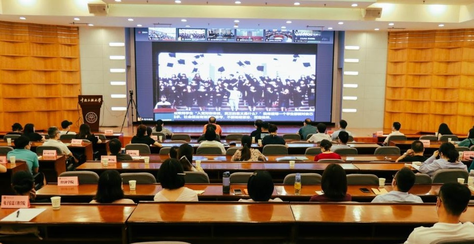 校党委书记边境,校党委副书记、副校长宋发军,党委宣传部、党委学工部、校团委等部门负责人,各学院学生工作负责人和全体辅导员在学术交流中心分会场参加会议。