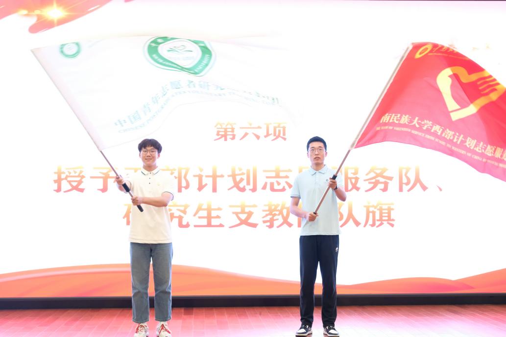 志愿者代表展示西部计划志愿服务队、研究生支教团队旗。 杨光煇摄